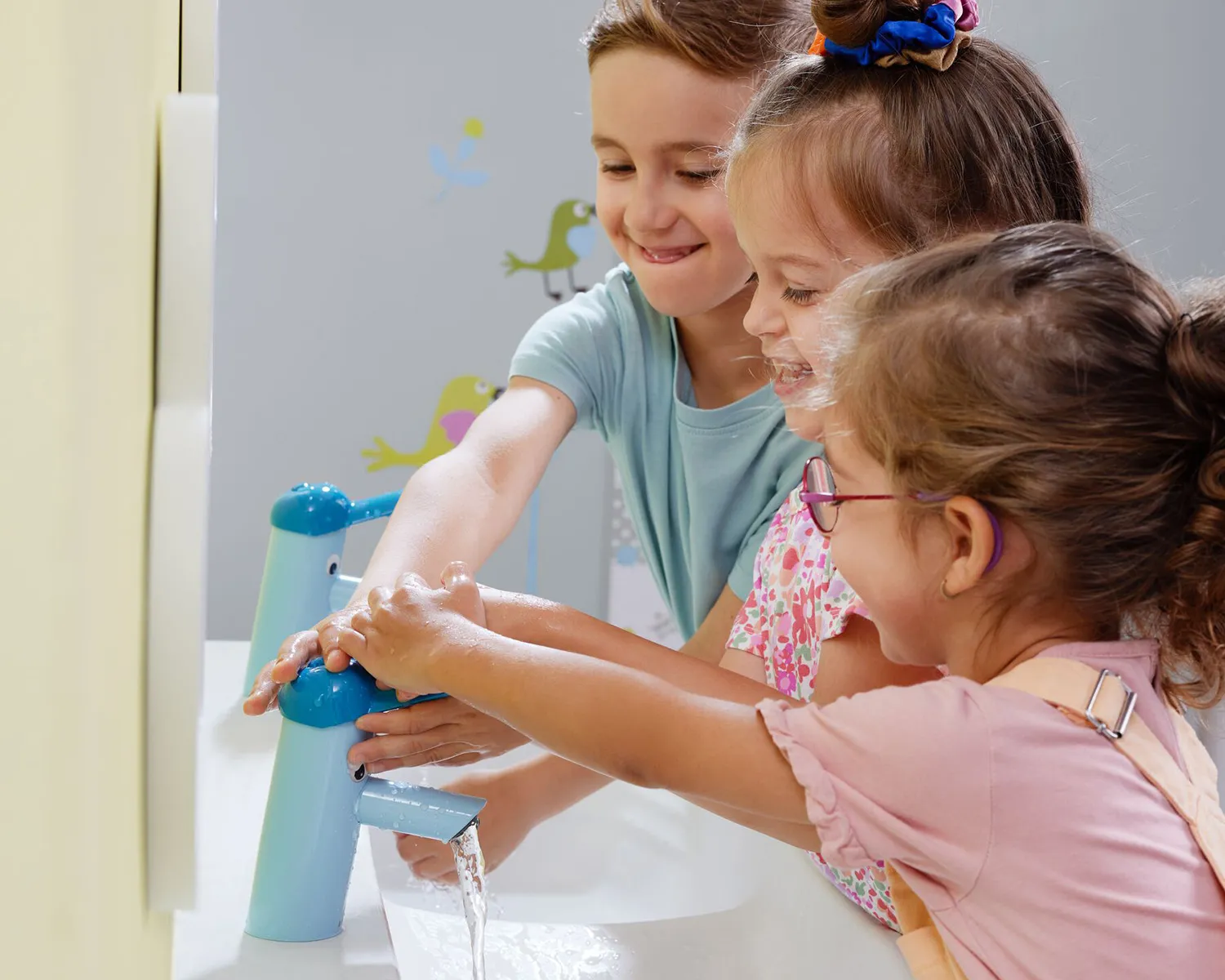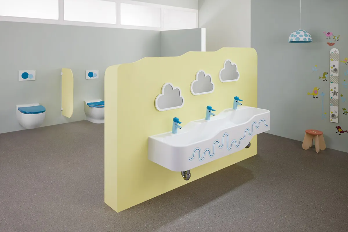 Ved å tilpasse fasilitetene kan leken også bringes inn i toalett- og servantområdet. Med de riktige produktene kan barna motiveres til både do-trening og håndvask. Som igjen skaper en god tilnærming til personlig helse og hygiene. Hos oss finner du den nye baderomsserien Bambini, som tilbyr toaletter og servanter tilpasset behovene til små og store barn.