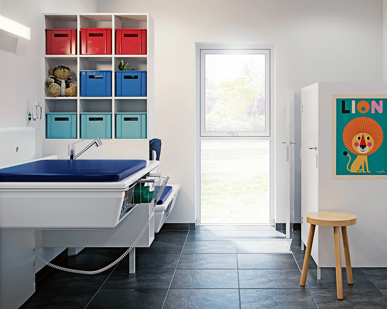 Et høyderegulerbart stellebord gjør det mulig å yte den beste omsorgen for barnet uten å belaste de ansatte. Med et barnevennlig design blir bleieskift nærmest som en lek for både barn og voksne.