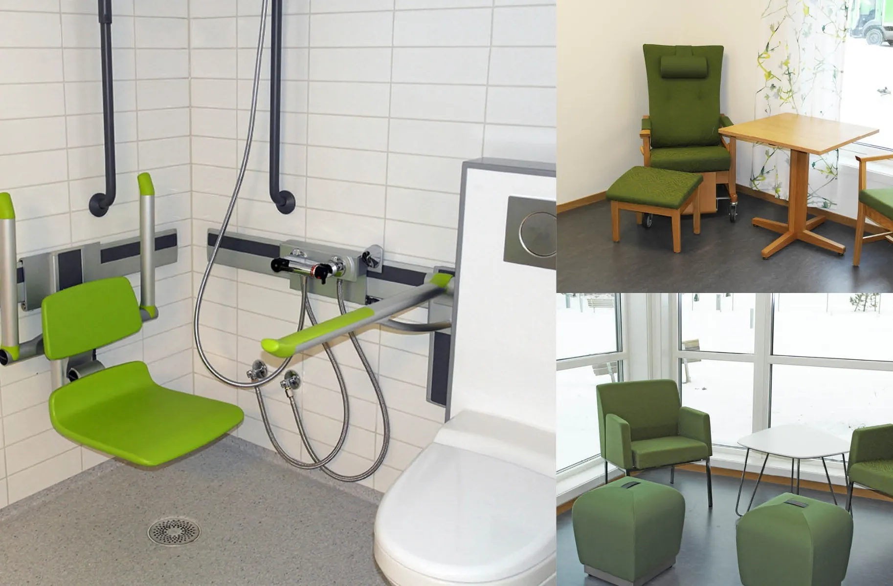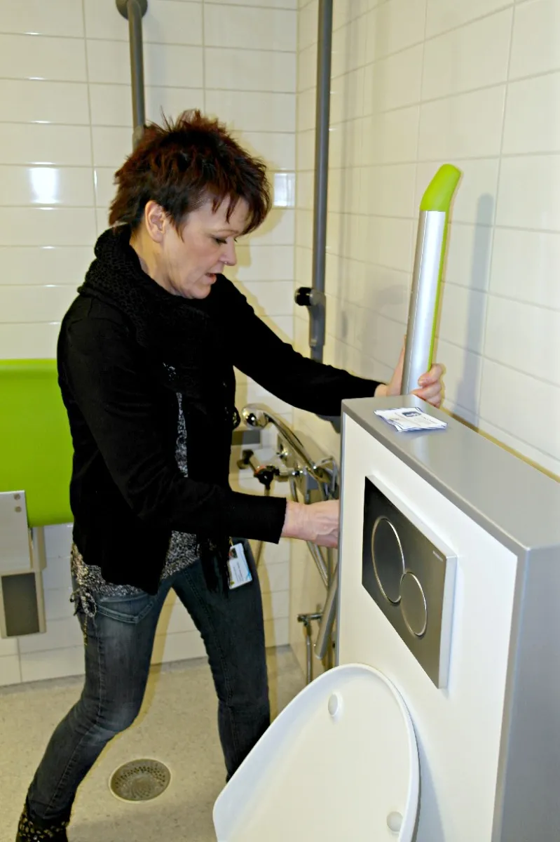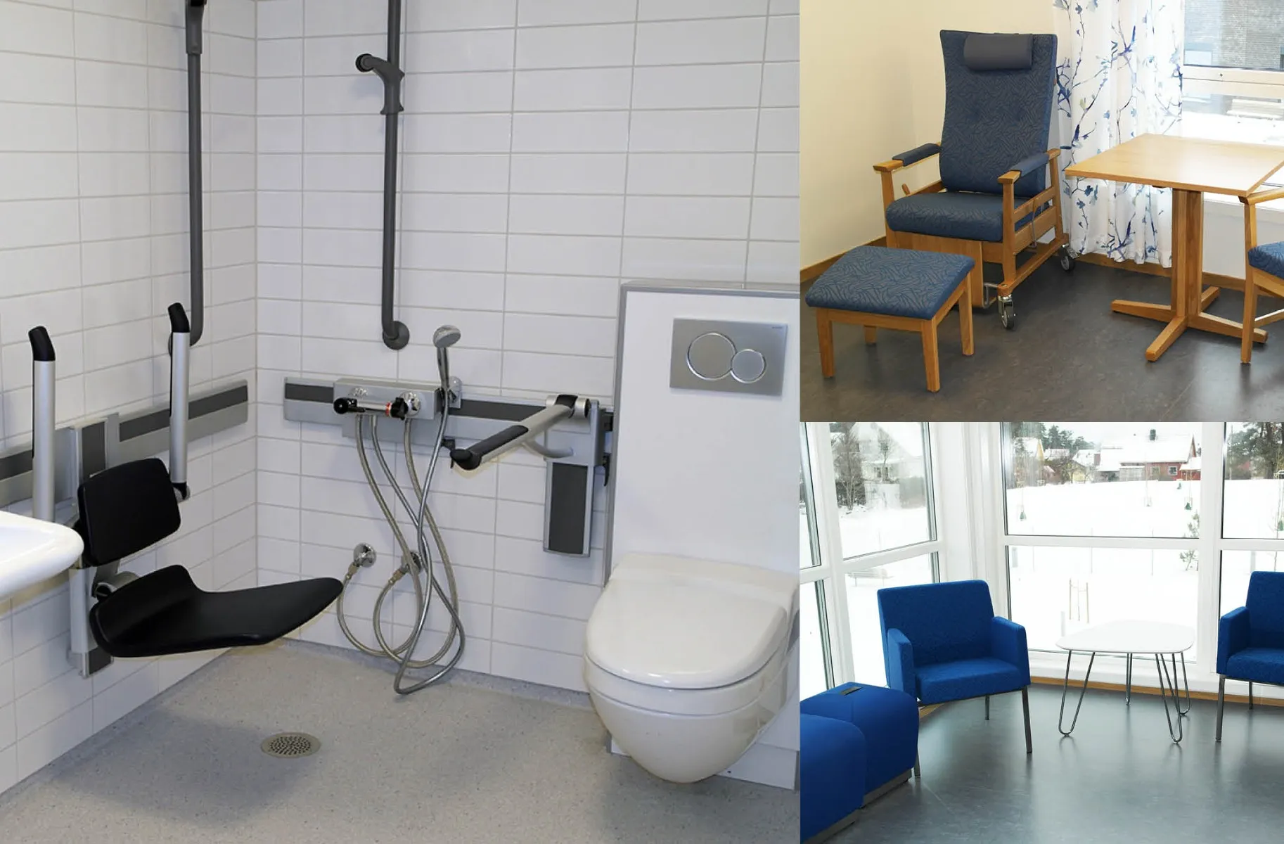 På alle badene er det montert veggskinner fra Pressalit sitt fleksible baderomskonsept. Dermed kan alle produkter flyttes sideveis i tillegg til at de kan justeres i høyden. Dette gir maksimal fleksibilitet slik at produktene lett tilpasses hver enkelt beboer, samtidig som det letter arbeidshverdagen for de ansatte. I tillegg er det på alle baderom montert dusjtoaletter fra Geberit.